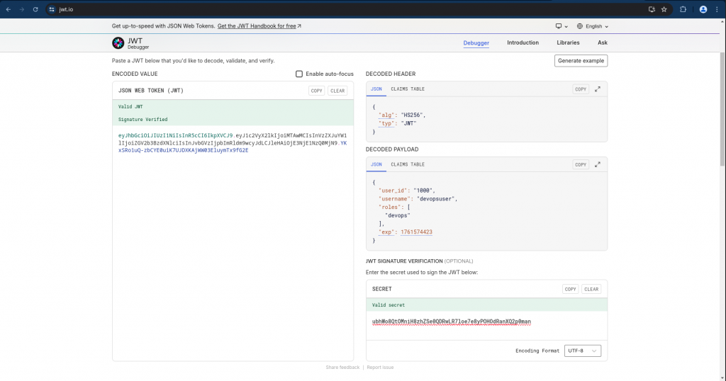 Decoded Payload: {'user_id': '1000', 'username': 'devopsuser', 'roles': ['devops'], 'exp': 1761574423}