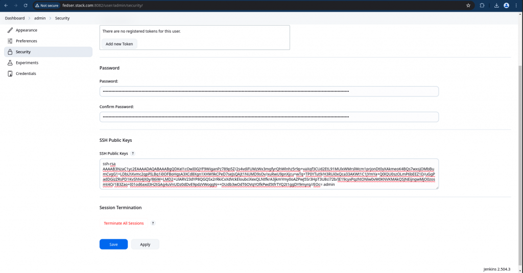 Let’s navigate to Manage Jenkins – Users and add the SSH public key (ie. admin_rsa.pub) content to the section shown below and save the changes.