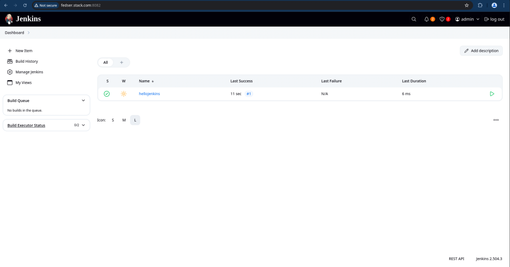 admin@fedser:jenkinscli-demo$ ssh -i ./admin_rsa -l admin -p 52222 fedser.stack.com create-job hellojenkins < hellojenkins.xml