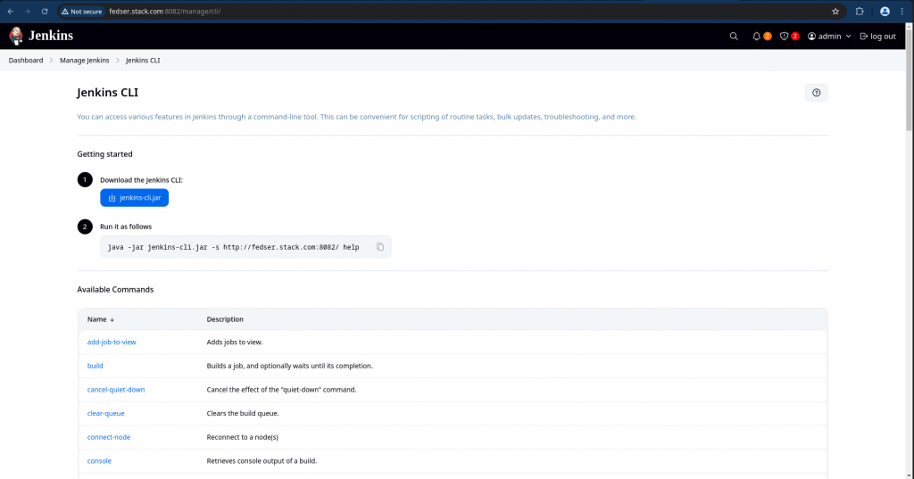 admin@fedser:jenkinscli-demo$ java -jar jenkins-cli.jar -s http://fedser.stack.com:8082/ -auth admin:admin@1234 help