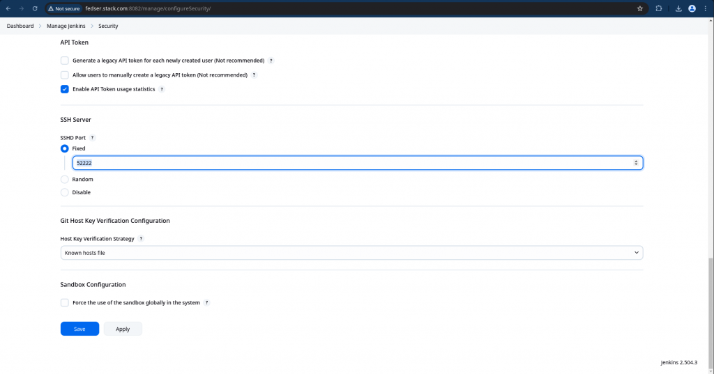 Now navigate to Manage Jenkins – Security and under the SSH server section, let’s enable SSH service on a fixed available port “52222” as shown below and save the settings.