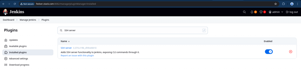 By default, the Jenkins installation does not come with SSH service enabled, We need to install the following plugin “SSH server” to “Add SSH server functionality to Jenkins, exposing CLI commands through it.”