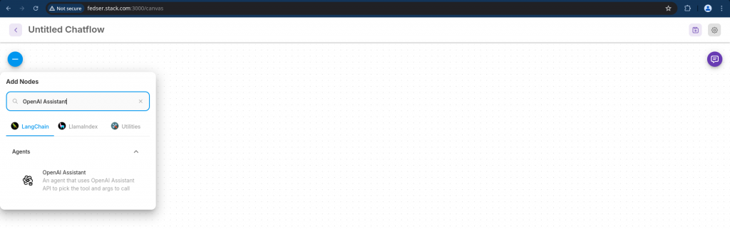Now, lets add the OpenAI Assistant node by searching as shown below and drag the node onto the board. This agent node will leverage the OpenAI assistant API to provide us with the relevant travel information.