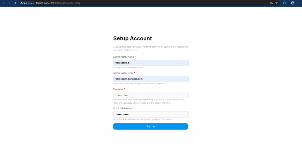 If you trying to access the Flowise AI portal for the first time, you need to setup the administrative account.