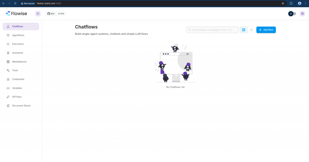 Navigate to Chatflows and Click on Add New, which will take you the Flowise visualization board as shown below.