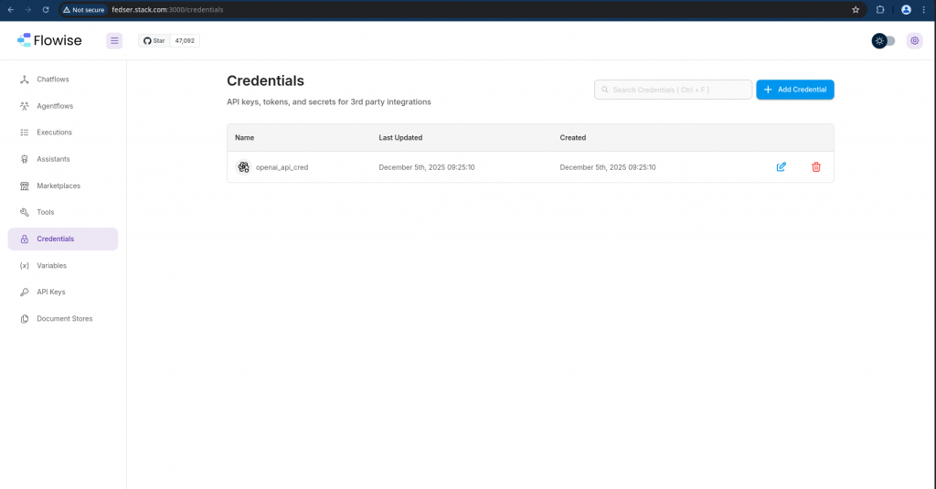 Navigate to Credentials – Add Credentials and search for OpenAI API. Now you can save your OpenAI credentials for later use.
