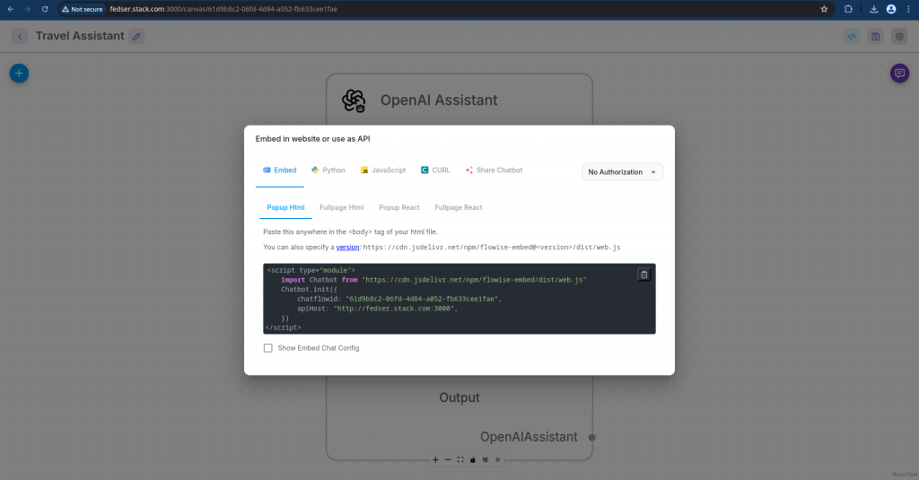 Now that our chat assistant is ready and responding, let try to integrate it into our single page html file.