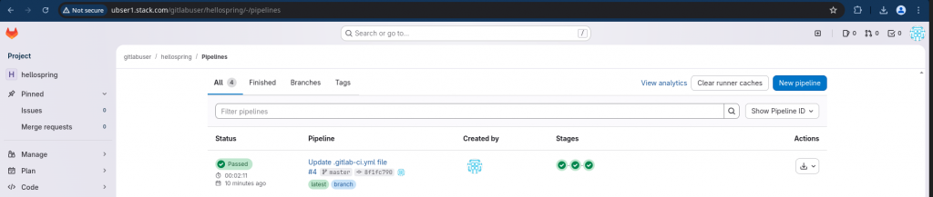 The user-mode requires you to manually start builds processing. So we need to run the following to ensure our gitlab runner is able to process the pipeline jobs.