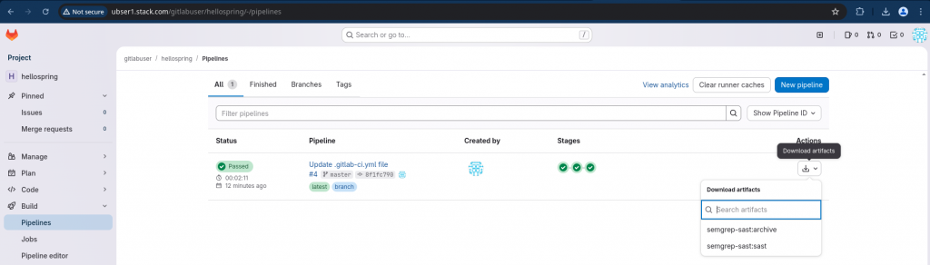 Now in your pipeline you can see the “download artifacts” option to download you SAST report in JSON format to analyze further.