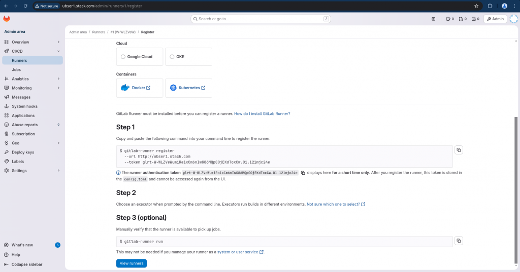 gitlab-runner register --url http://ubser1.stack.com --token glrt-W-WLZVeWumiRa1xCm6nIwG86MQp0OjEKdToxCw.01.121mjc24e