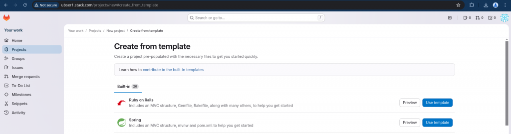 For this demo lets create a gitlab project using a sample “Spring” template as shown below.